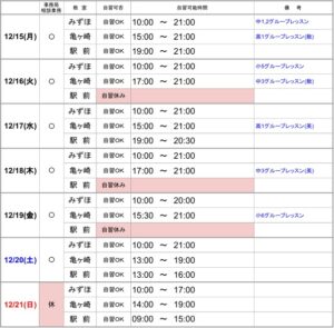 【酒田】自習可能時間のお知らせ(12/15~12/21)