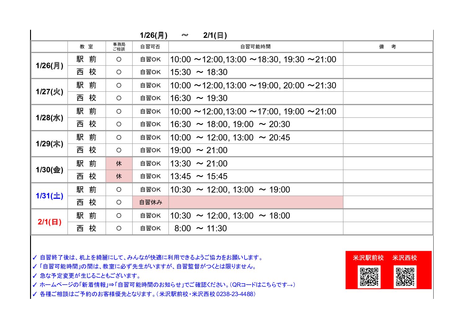 お知らせ TOP お知らせ/新着情報 【米沢駅前・西校】自習可能時間のお知らせ(1/26~2/1) 2026.01.26 【米沢駅前・西校】自習可能時間のお知らせ(1/26~2/1) 「新着情報」一覧へ戻る 2026.02.02 【米沢駅前・西校】自習可能時間のお知らせ(2/2~2/8) NEW 2026.01.31 【酒田】自習可能時間のお知らせ(2/2~2/8) NEW 2026.01.26 【米沢駅前・西校】自習可能時間のお知らせ(1/26~2/1) NEW 資料請求 無料教育相談お申込み 各事務局の最新情報をcheck! ▶山形事務局 ▶米沢事務局 ▶長井事務局 ▶鶴岡事務局 ▶新庄事務局 ▶東根事務局 ▶天童事務局 ▶寒河江事務局 ▶酒田事務局