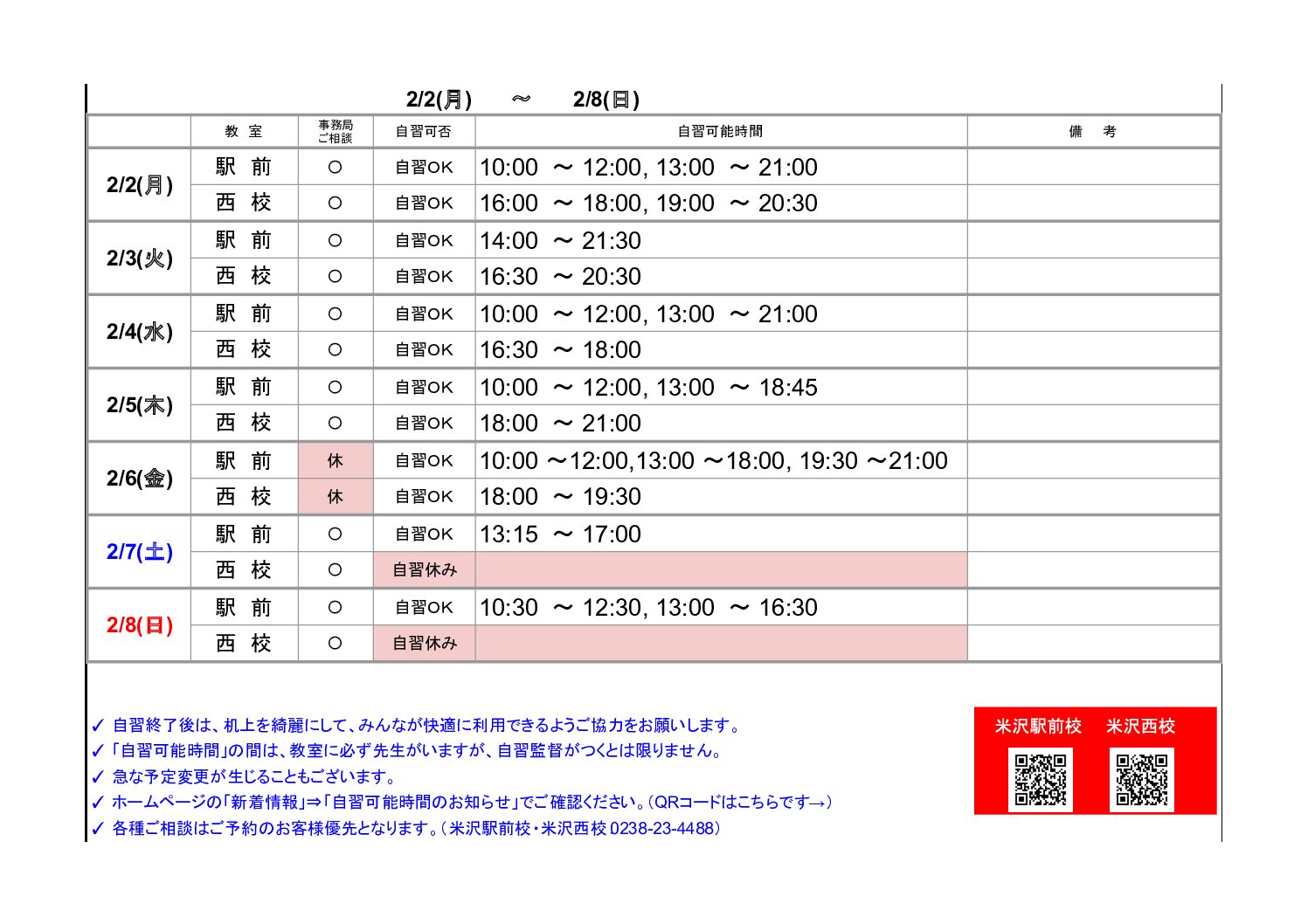 お知らせ TOP お知らせ/新着情報 【米沢駅前・西校】自習可能時間のお知らせ(2/2~2/8) 2026.02.02 【米沢駅前・西校】自習可能時間のお知らせ(2/2~2/8) 「新着情報」一覧へ戻る 2026.02.02 【米沢駅前・西校】自習可能時間のお知らせ(2/2~2/8) NEW 2026.01.31 【酒田】自習可能時間のお知らせ(2/2~2/8) NEW 2026.01.26 【米沢駅前・西校】自習可能時間のお知らせ(1/26~2/1) NEW 資料請求 無料教育相談お申込み 各事務局の最新情報をcheck! ▶山形事務局 ▶米沢事務局 ▶長井事務局 ▶鶴岡事務局 ▶新庄事務局 ▶東根事務局 ▶天童事務局 ▶寒河江事務局 ▶酒田事務局