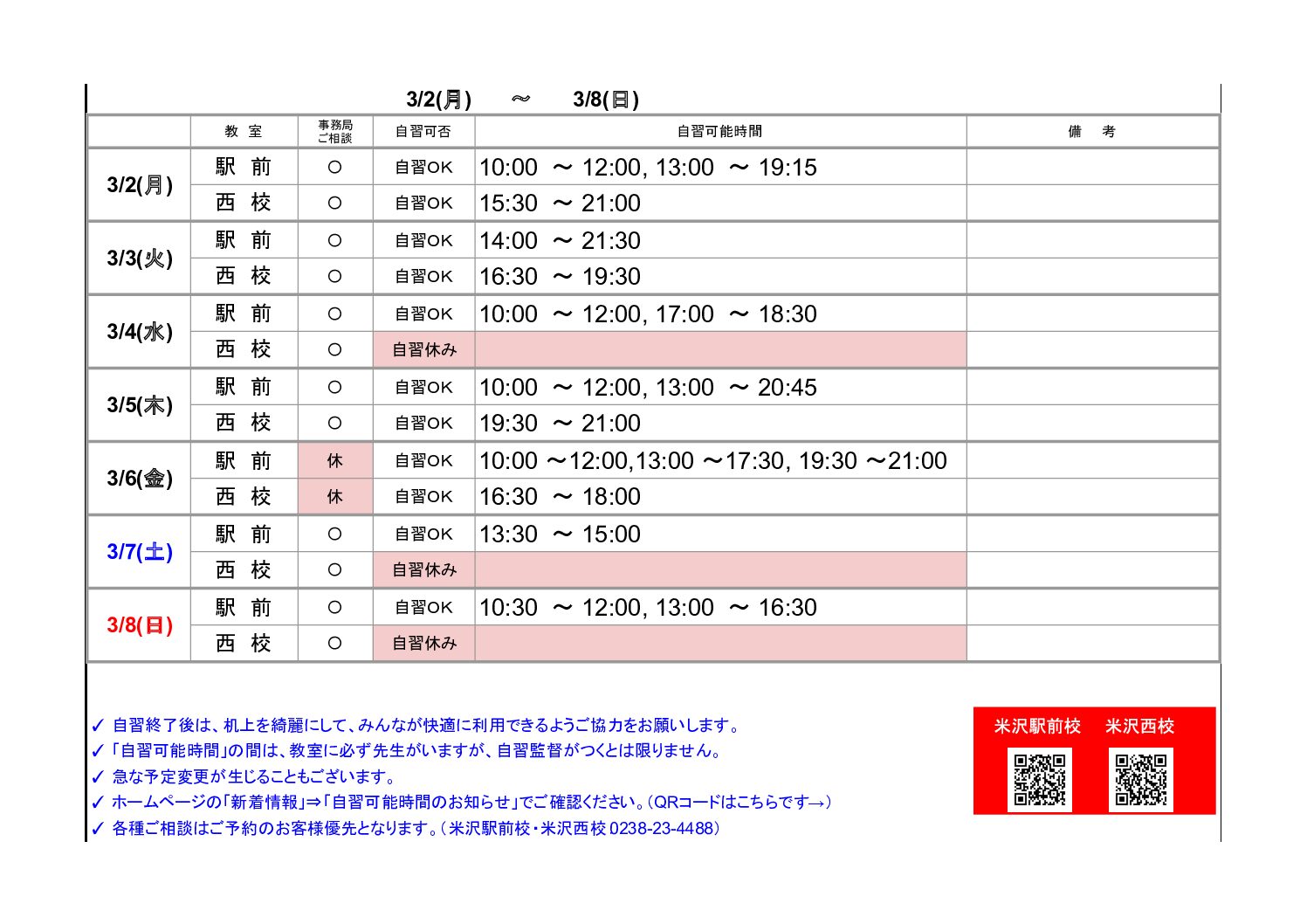 お知らせ TOP お知らせ/新着情報 【米沢駅前・西校】自習可能時間のお知らせ(3/2~3/8) 2026.03.02 【米沢駅前・西校】自習可能時間のお知らせ(3/2~3/8) 「新着情報」一覧へ戻る 2026.03.02 【米沢駅前・西校】自習可能時間のお知らせ(3/2~3/8) NEW 2026.02.28 【酒田】自習可能時間のお知らせ(2/28~3/8) NEW 2026.02.24 【米沢駅前・西校】自習可能時間のお知らせ(2/23~3/1) NEW 資料請求 無料教育相談お申込み 各事務局の最新情報をcheck! ▶山形事務局 ▶米沢事務局 ▶長井事務局 ▶鶴岡事務局 ▶新庄事務局 ▶東根事務局 ▶天童事務局 ▶寒河江事務局 ▶酒田事務局