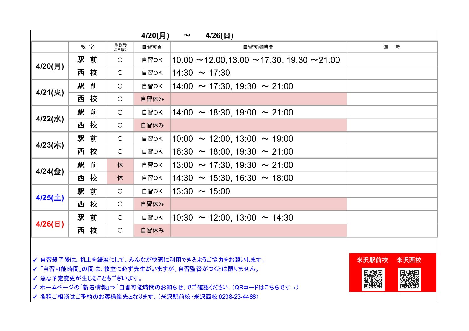お知らせ TOP お知らせ/新着情報 【米沢駅前・西校】自習可能時間のお知らせ(4/20~4/26) 2026.04.20 【米沢駅前・西校】自習可能時間のお知らせ(4/20~4/26) 「新着情報」一覧へ戻る 2026.04.20 【米沢駅前・西校】自習可能時間のお知らせ(4/20~4/26) NEW 2026.04.18 【酒田】自習可能時間のお知らせ(4/20~4/26) NEW 2026.04.13 【米沢駅前・西校】自習可能時間のお知らせ(4/13~4/19) NEW 資料請求 無料教育相談お申込み 各事務局の最新情報をcheck! ▶山形事務局 ▶米沢事務局 ▶長井事務局 ▶鶴岡事務局 ▶新庄事務局 ▶東根事務局 ▶天童事務局 ▶寒河江事務局 ▶酒田事務局