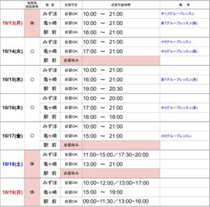 【酒田】自習可能時間のお知らせ(10/13~10/19)