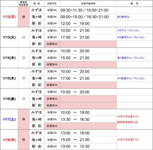 【酒田】自習可能時間のお知らせ(1/12~1/18)