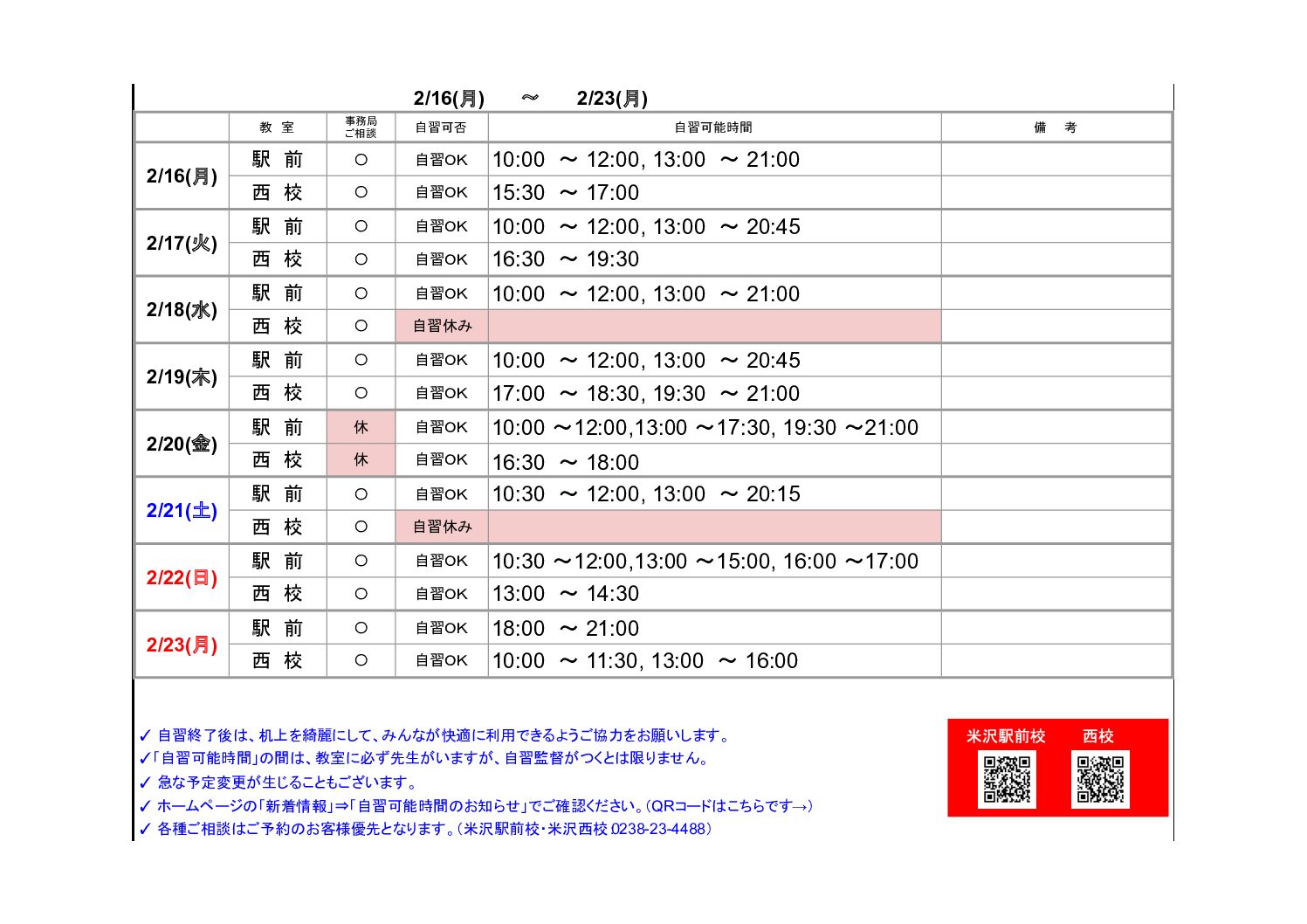 【米沢駅前・西校】自習可能時間のお知らせ(2/16~2/23)