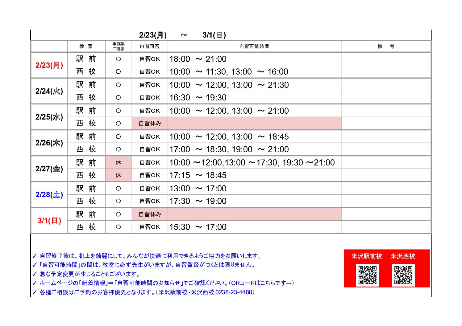 【米沢駅前・西校】自習可能時間のお知らせ(2/23~3/1)