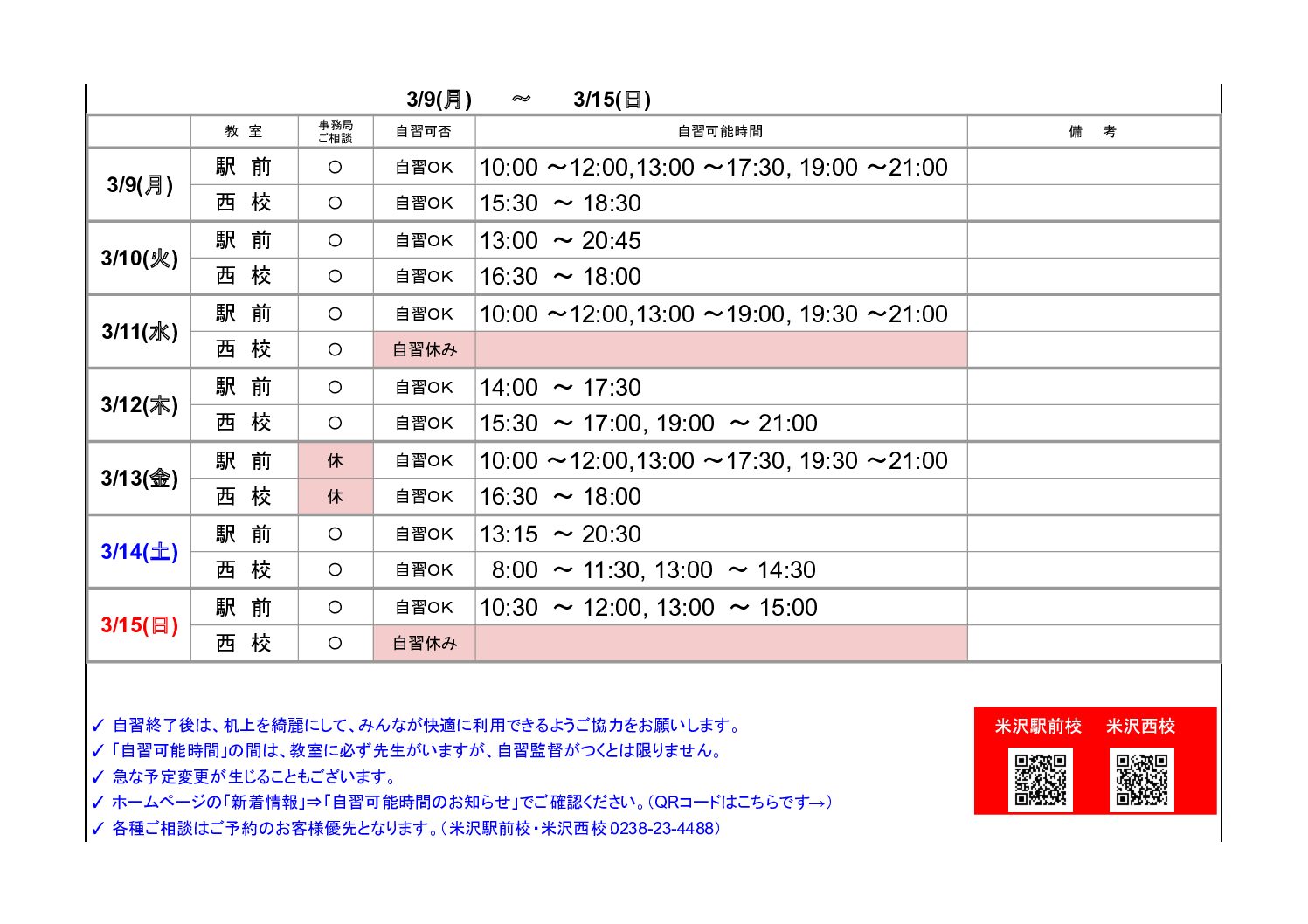 【米沢駅前・西校】自習可能時間のお知らせ(3/9~3/15)